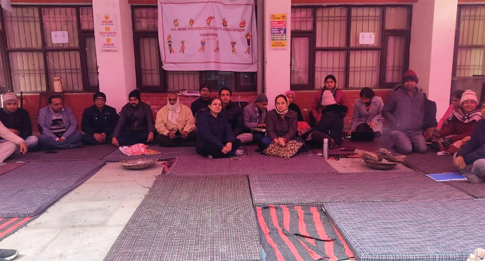 फरीदाबाद, 20 जनवरी। फ़रीदाबाद में जे.सी. बोस विश्वविद्यालय में प्रशासन के ख़िलाफ़ फैकल्टी एसोसिएशन द्वारा आयोजित भूख हड़ताल दूसरे दिन और समग्र धरना पांचवें दिन में प्रवेश कर गया। चूंकि प्रशासन सोलह पदोन्नति मामलों को गैरकानूनी तरीके से खारिज करने पर अड़ा हुआ है और फैकल्टी एसोसिएशन (जेयूएफए) इस अन्याय के खिलाफ एकजुट है।