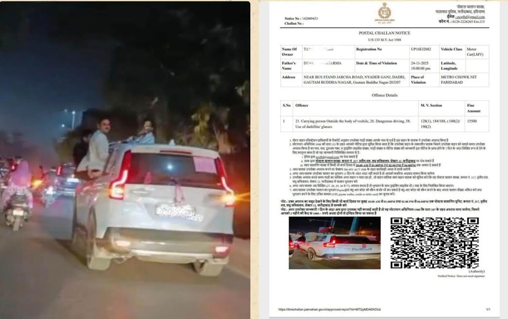 फरीदाबाद। स्कॉर्पियो गाड़ी से स्टंटबाजी करने के मामले में फरीदाबाद पुलिस ने 15500 रुपये का चालान किया है।