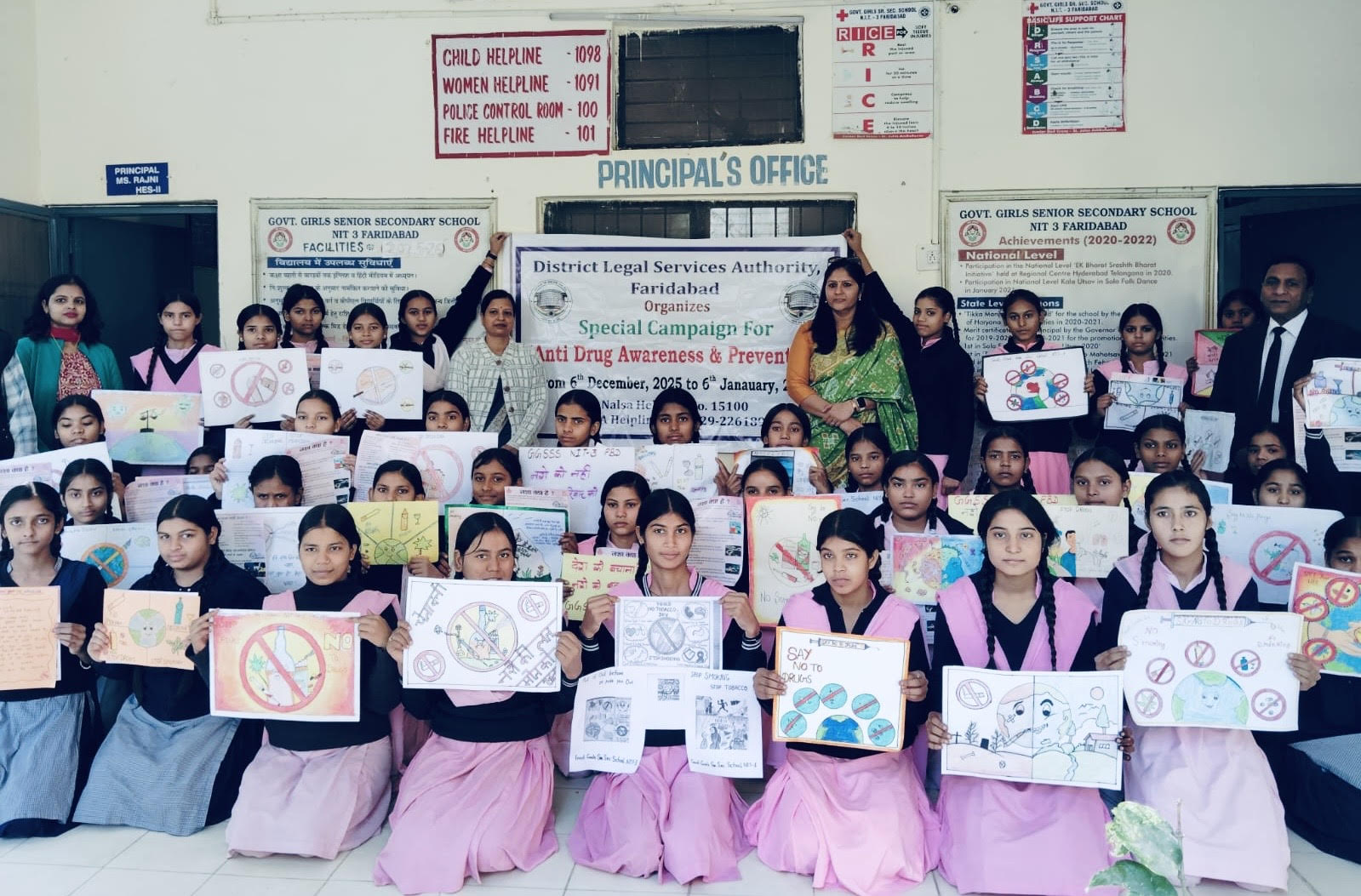 फरीदाबाद । जिला विधिक सेवा प्राधिकरण (DLSA), फरीदाबाद द्वारा ड्रग फ्री हरियाणा मिशन के अंतर्गत जिला फरीदाबाद के सभी सरकारी विद्यालयों में नशा विरोधी पोस्टर मेकिंग कार्यक्रम का आयोजन किया गया। इसी क्रम में यह कार्यक्रम राजकीय कन्या वरिष्ठ माध्यमिक विद्यालय, एनआईटी नंबर–3, फरीदाबाद में भी आयोजित किया गया।