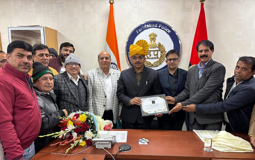 फरीदाबाद। फरीदाबाद पुलिस शहर में कानून व्यवस्था बनाए रखने के लिए प्रतिबद्ध है और अपराधियों पर लगातार कार्रवाई कर रही है। आज फरीदाबाद जिला के व्यापार मंडल के प्रधान राम जुनेजा व अन्य सदस्यों सहित लगभग 50 व्यक्तियों ने पुलिस के साहसिक कार्यों के लिए पुलिस आयुक्त सतेंद्र कुमार गुप्ता का धन्यवाद किया है। फरीदाबाद व्यापार मंडल के लगभग 50 सदस्य कार्यालय पुलिस सेक्टर 21सी में आये और फरीदाबाद पुलिस द्वारा अपराधियों पर की जा रही कार्रवाई तथा शहर में कानून-व्यवस्था बनाये रखने के लिए पुलिस आयुक्त सतेंद्र कुमार गुप्ता को पगड़ी पहनकर फरीदाबाद पुलिस का धन्यवाद किया।