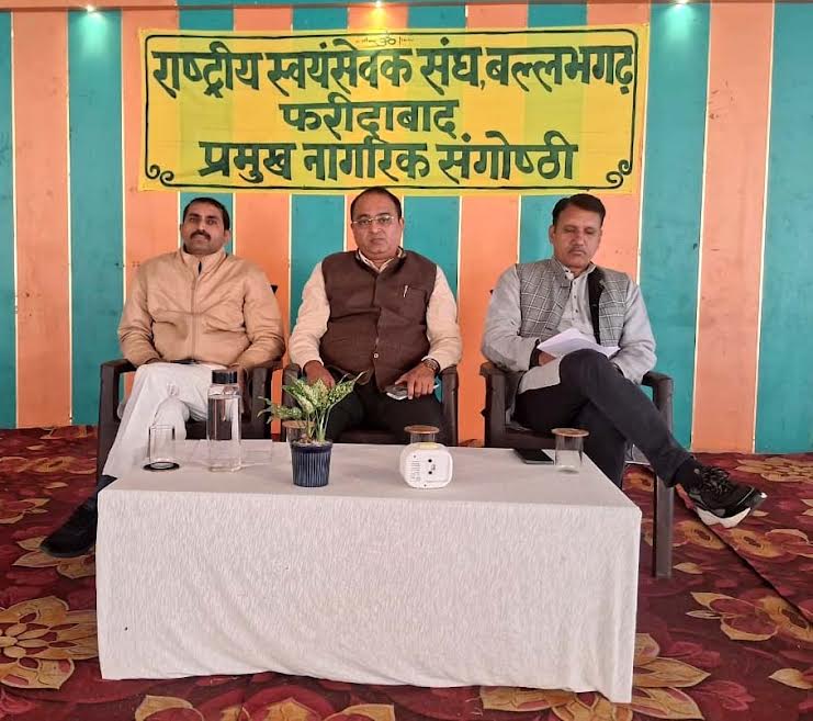 फरीदाबाद। राष्ट्रीय स्वयंसेवक संघ के 100 वर्ष पूर्ण होने के उपलक्ष्य में रविवार को नागरिक विचार गोष्ठी का आयोजन किया गया। इस कार्यक्रम का मुख्य विषय ‘राष्ट्रीय स्वयंसेवक संघ के शताब्दी वर्ष व पंच परिवर्तन की समाज निर्माण में भूमिका’ रहा। गोष्ठी में क्षेत्र के अनेक प्रबुद्ध जन, गणमान्य नागरिक और स्वयंसेवक उपस्थित रहे, जिन्होंने राष्ट्र निर्माण के इस मिशन में अपनी सक्रिय भागीदारी का संकल्प लिया। सेक्टर-3 स्थित सामुदायिक भवन में संघ शताब्दी वर्ष के अंतर्गत आयोजित विचार गोष्ठी में आईएमटी अध्यक्ष एवं उद्योगपति हेमंत कुमार शर्मा ने अपने उद्बोधन में  ‘पंच परिवर्तन’ के लक्ष्यों पर विस्तार से प्रकाश डाला। उसके उपरांत मुख्य वक्ता के रूप में सुप्रीम कोर्ट के वरिष्ठ अधिवक्ता दीपक ठकराल ने कहा कि संघ की 100 वर्षों की यात्रा राष्ट्र को परम वैभव पर ले जाने का संकल्प है। उन्होंने जोर देकर कहा कि समाज निर्माण में न्याय और राष्ट्रवाद का सामंजस्य आवश्यक है। उनके अनुसार, शताब्दी वर्ष केवल उत्सव नहीं, बल्कि समाज के हर वर्ग को साथ लेकर चलने और राष्ट्र के प्रति अपने कर्तव्यों को समझने का समय है।