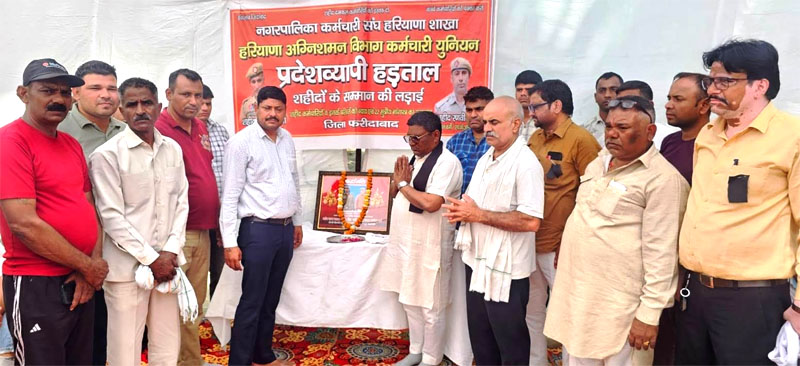 फरीदाबाद। अग्निशमन विभाग के कर्मचारियों की हड़ताल 13 वें दिन में प्रवेश सर्व कर्मचारी संघ हरियाणा एवं नगर पालिका कर्मचारी संघ हरियाणा के राज्य प्रधान नरेश कुमार शास्त्री ने एन.एच.एक स्थित फायर स्टेशन पर पहुंचकर हड़ताली कर्मचारियों का हौंसला बढ़ाते हुए आंदोलन को तेज करने का ऐलान किया है। उन्होंने 22 अप्रैल से 25 अप्रैल तक न्याय की पुकार विधायकों के दरबार कार्यक्रम के तहत सभी विधायकों एवं मंत्रियों को ज्ञापन देने एवं 27 अप्रैल से अग्निशमन एवं पालिका कर्मचारी संघ ने संयुक्त रूप से क्रमिक भूख हड़ताल करने का ऐलान कर दिया है। नगरपालिका कर्मचारी संघ, हरियाणा के आह्वान पर आज प्रदेश के सभी 11नगर निगमों, 22 नगर परिषदों एवं 59 नगर पालिकाओं के हजारों कर्मचारियों ने काले बिल्ले लगाकर जनता के बीच काम करते हुए सरकार के कर्मचारी एवं दलित विरोधी चेहरे को बेनकाब करने का अभियान शुरू कर दिया है।